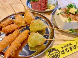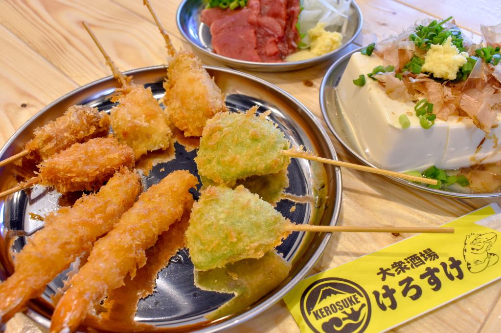 ・くしあげ 80円~ ・肉刺し 390円~ ・煮込み料理 390円~ ・けろりん桶酒 980円 ※税抜き |