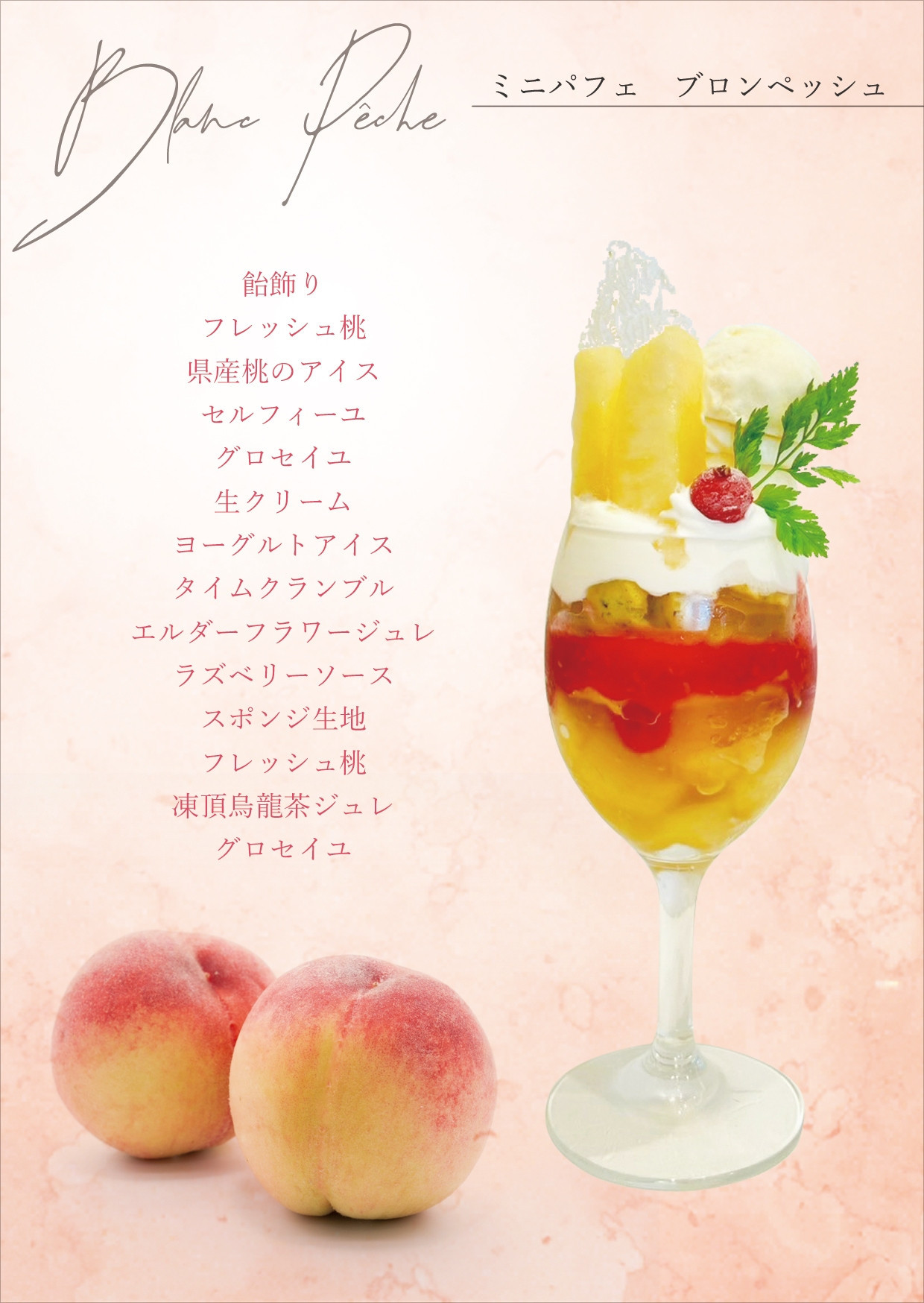 ꧁——————————꧂ 🍑BLANC PÊCHE  ブロンペッシュ 山梨県産の旬の桃のパルフェ 瑞々しい桃に、ヨーグルトアイスや 凍頂烏龍茶ジュレなどをあわせた 夏らしくさっ...