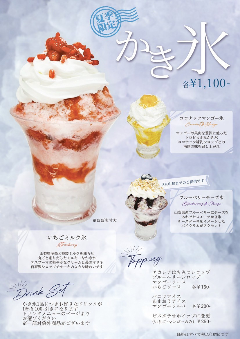 夏季限定のかき氷 セレスカフェならではのスイーツ系かき氷! 𓈒 𓏸 𓐍 𓂃 𓈒𓏸 𓂃◌𓈒𓐍 𓈒𓈒 𓏸 𓐍 メニューは3種  各種¥1,100(税込) 🍓山梨県産苺を使用した  ...