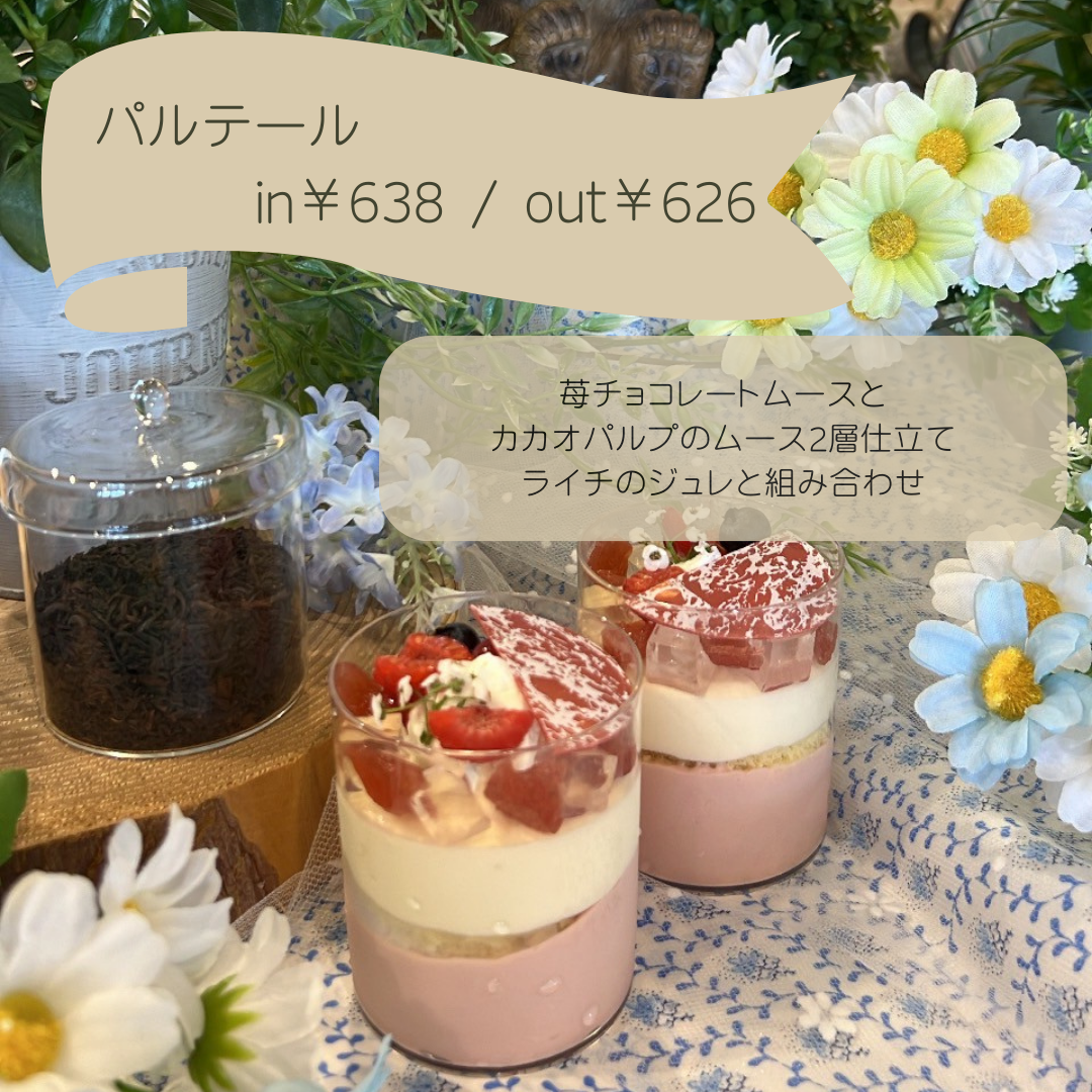 ・アシェットデセール (一皿盛りデザート ドリンク付き) ※価格は季節メニューにより異なる ・ケーキ 360円~ ・ドリンク 400円~ ・ホールケーキ(予約制) ※全て税別 |