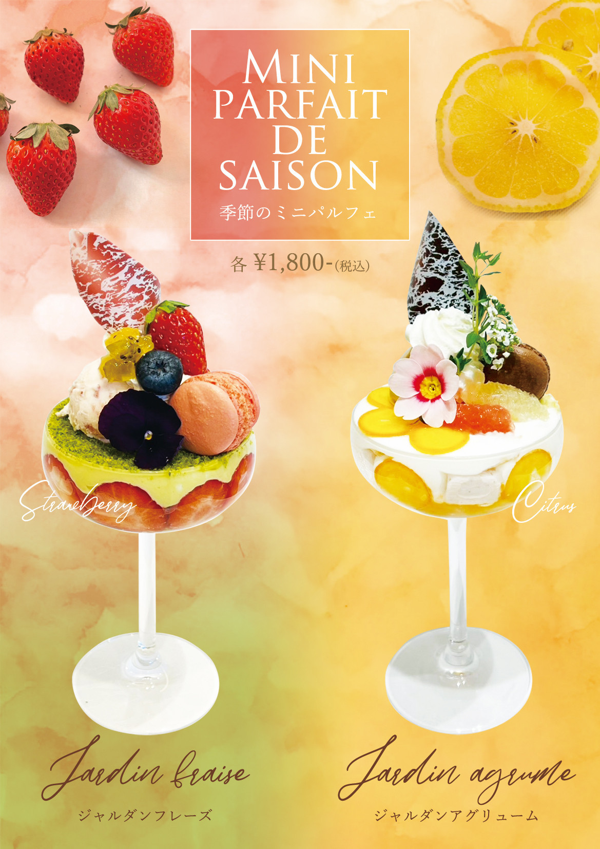 セレスカフェでは季節の果物など 使用したパフェを提供中です! 現在は ・ジャルダンフレーズ(苺のパフェ) ・ジャルダンアグリューム(柑橘のパフェ) の2種をご用意しております♬ ご...