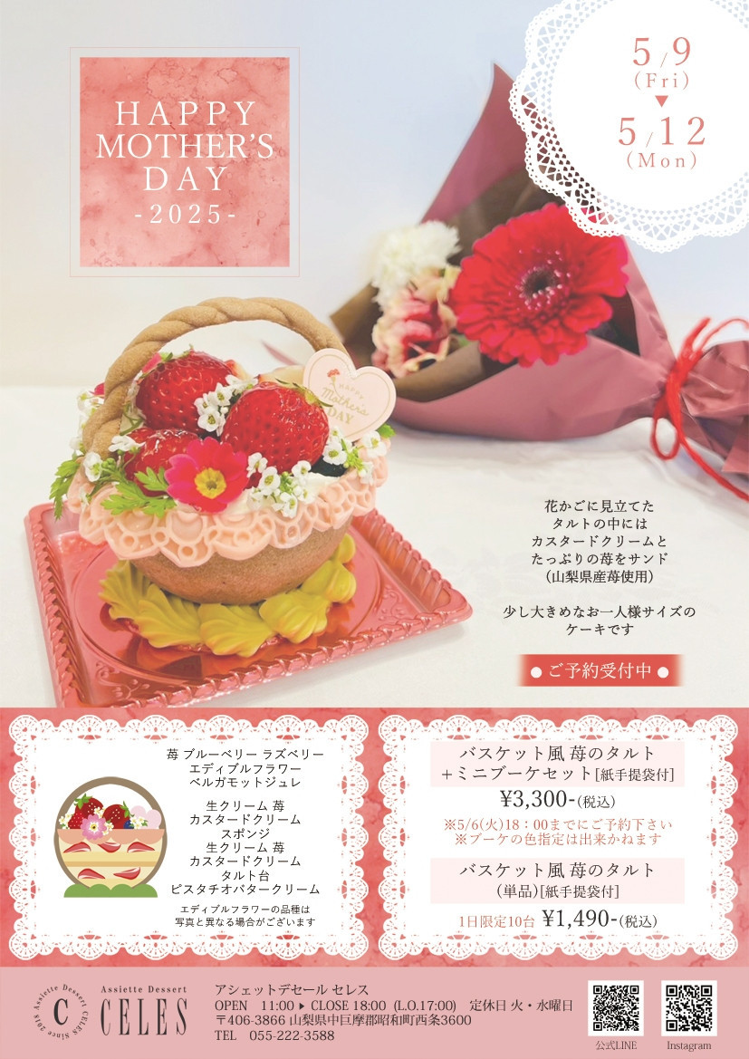 いつもセレスカフェをご利用いただきまして、 誠にありがとうございます°˖✧ 本日は、 【母の日限定 オリジナルケーキ】 のご紹介です♬ 今年は、花かごをイメージした 苺のタルトケー... -