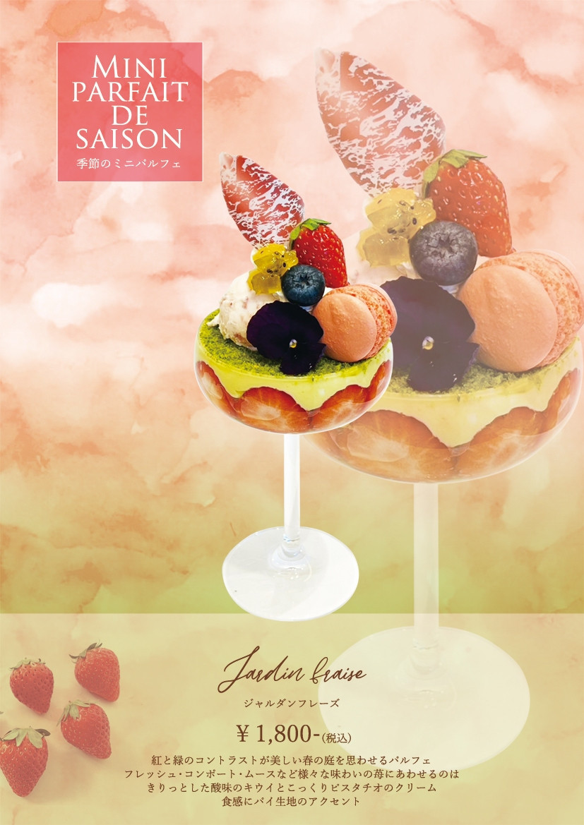 山梨県産の苺をたっぷり使用した 苺パフェも好評販売中です💛 🍓ジャルダン・フレーズ ¥1,800(税込) 苺の庭という名前のパルフェは 名前の通り、庭に見立てたビジュアルで グ...