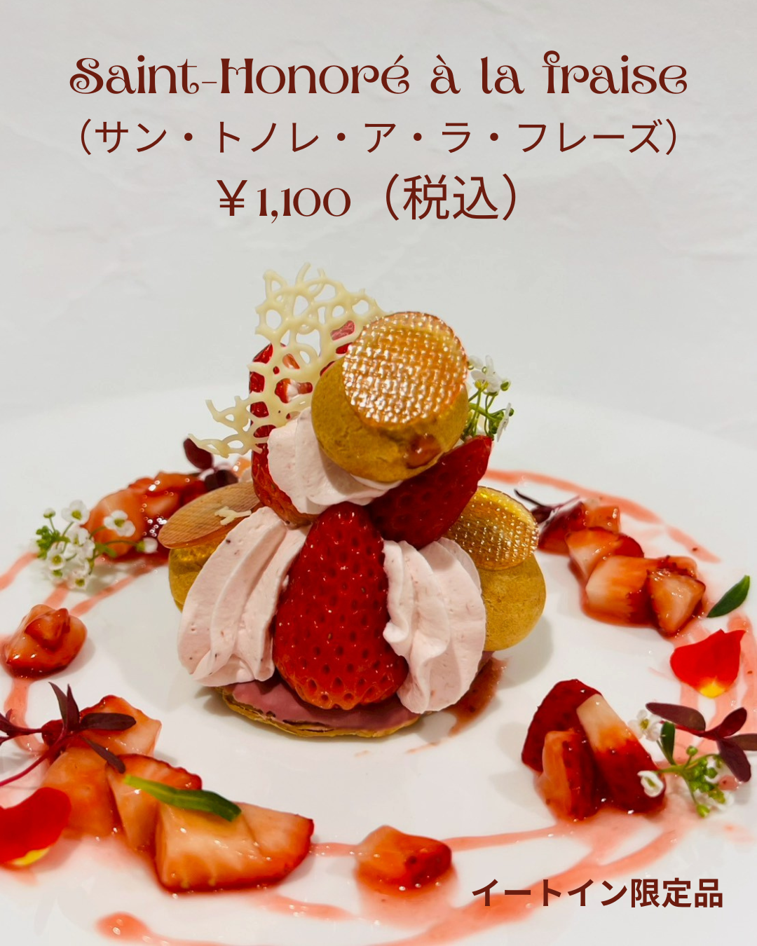 現在開催中の【苺フェア】では、 イートイン限定のケーキもご用意しております♬ 《苺のサントノーレ》 ¥1,100(税込) サクサクのパイ生地を土台に いちごジャム入りのプチシュー... -