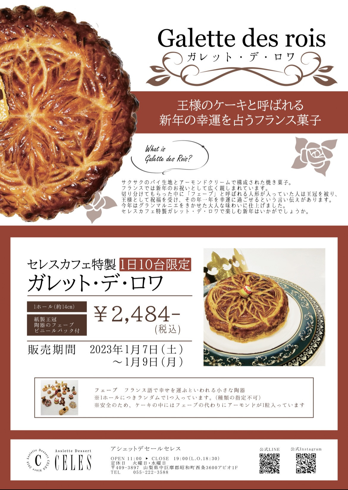 新年をお祝いするスイーツと言えば 【ガレット・デ・ロワ】 セレスカフェでは、今年初めてガレットデロワの販売を行います。 数量限定となりますので、 詳細をご確認いただきまして、 是非ご購入...