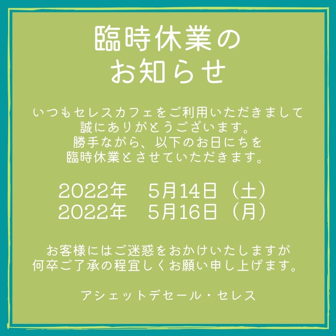 いつもセレスカフェをご利用いただきまして、誠にありがとうございます! 勝手ながら、下記のお日にちを臨時休業とさせていただきます。 ★5月14日(土) ★5月16日(月) お客様には...