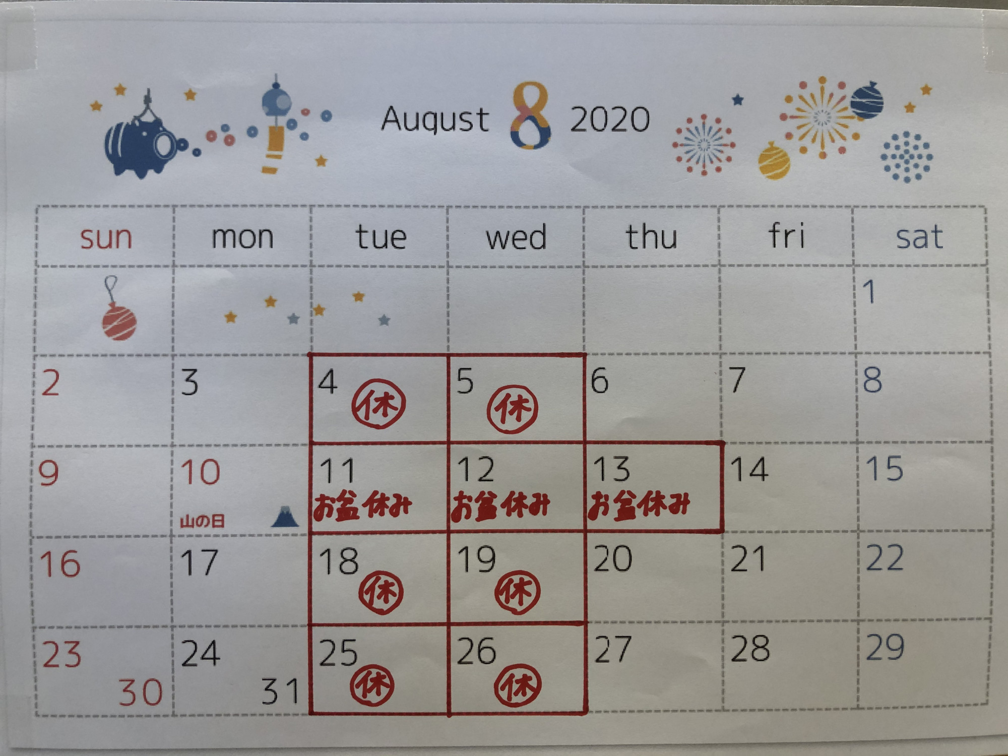 8月のセレスカフェの営業カレンダーです。 今年はお盆期間の中から、11~13日の3日間を連休を頂きます。 定休日は毎週火曜、水曜となっております。 また、営業時間は通常通り11:00~19:00... -