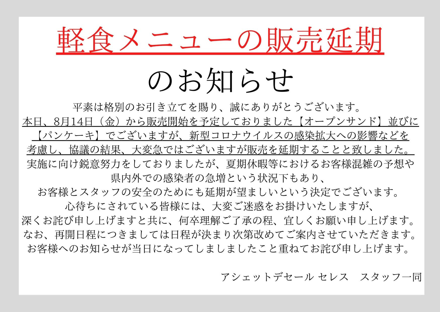 平素は格別のお引き立てを賜り、誠にありがとうございます。 本日、8月14日(金)から販売開始を予定しておりました【オープンサンド】並びに 【パンケーキ】でございますが、新型コロナウイルスの感染拡... -