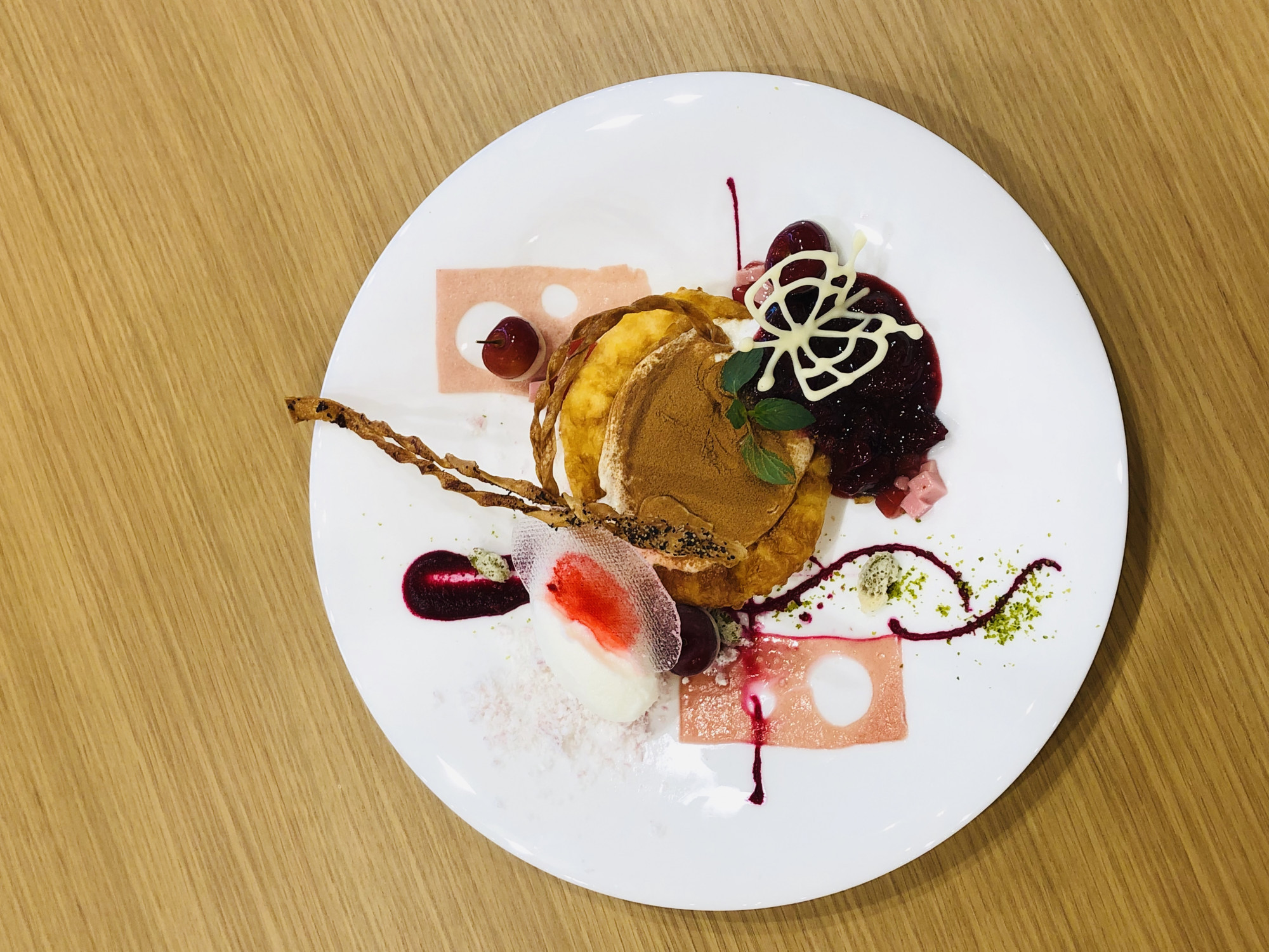 アシェットデセールの新作です🤗 さくらんぼ沢山!! 見た目も可愛い!綺麗!! クレームダンジュの登場です💞 ほうとうの麺で作ったペッパーのチュイルの食感も是非お試しください。 食の祭典での受...