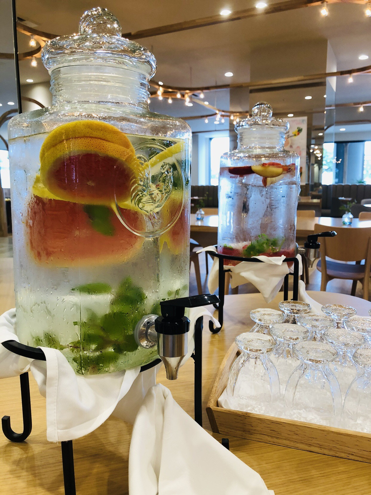 カフェ店内では、季節フルーツとハーブを入れて作ったデトックスウォーターを設置してあります💕