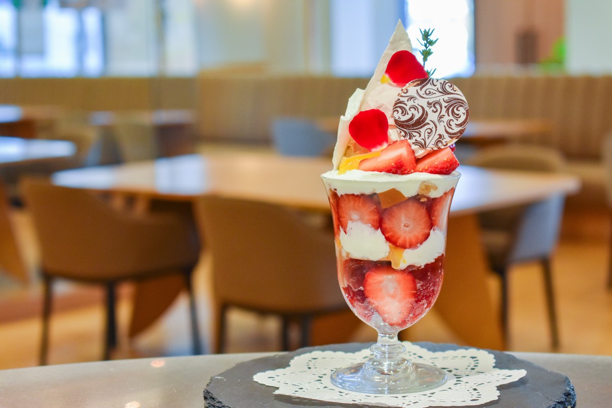 採れたての苺をたっぷり使ったパフェ。ゆずマー…
