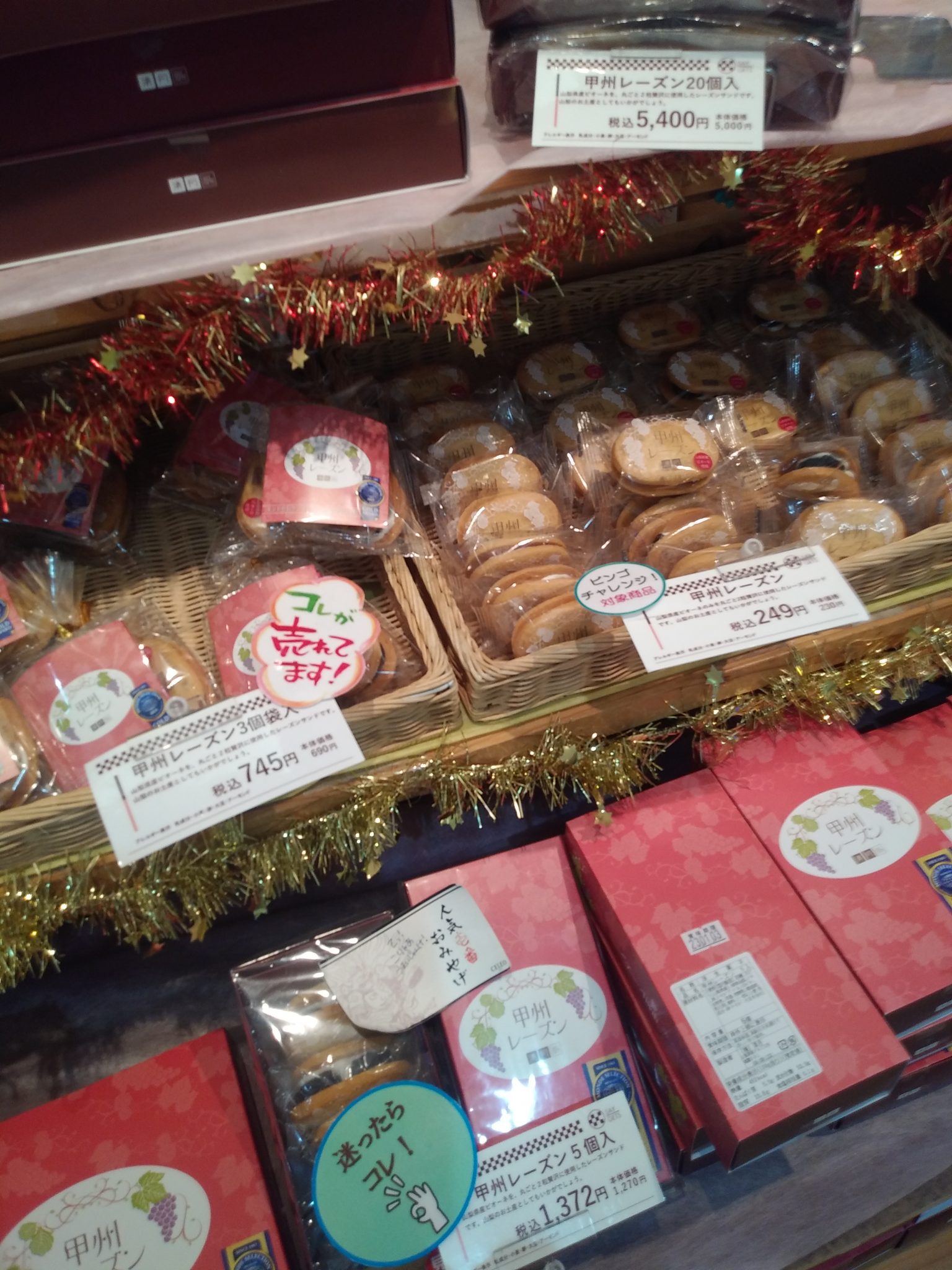 甲州レーズンという商品は、バター風味のサブレ生地に、クリームと大粒レーズンがサンドされています。県産ピオーネのレーズンのようで、とっても粒が大きくて美味しいです。種は入っていないので、食べやすいです。サブレ生地の食感も良く、おすすめです。