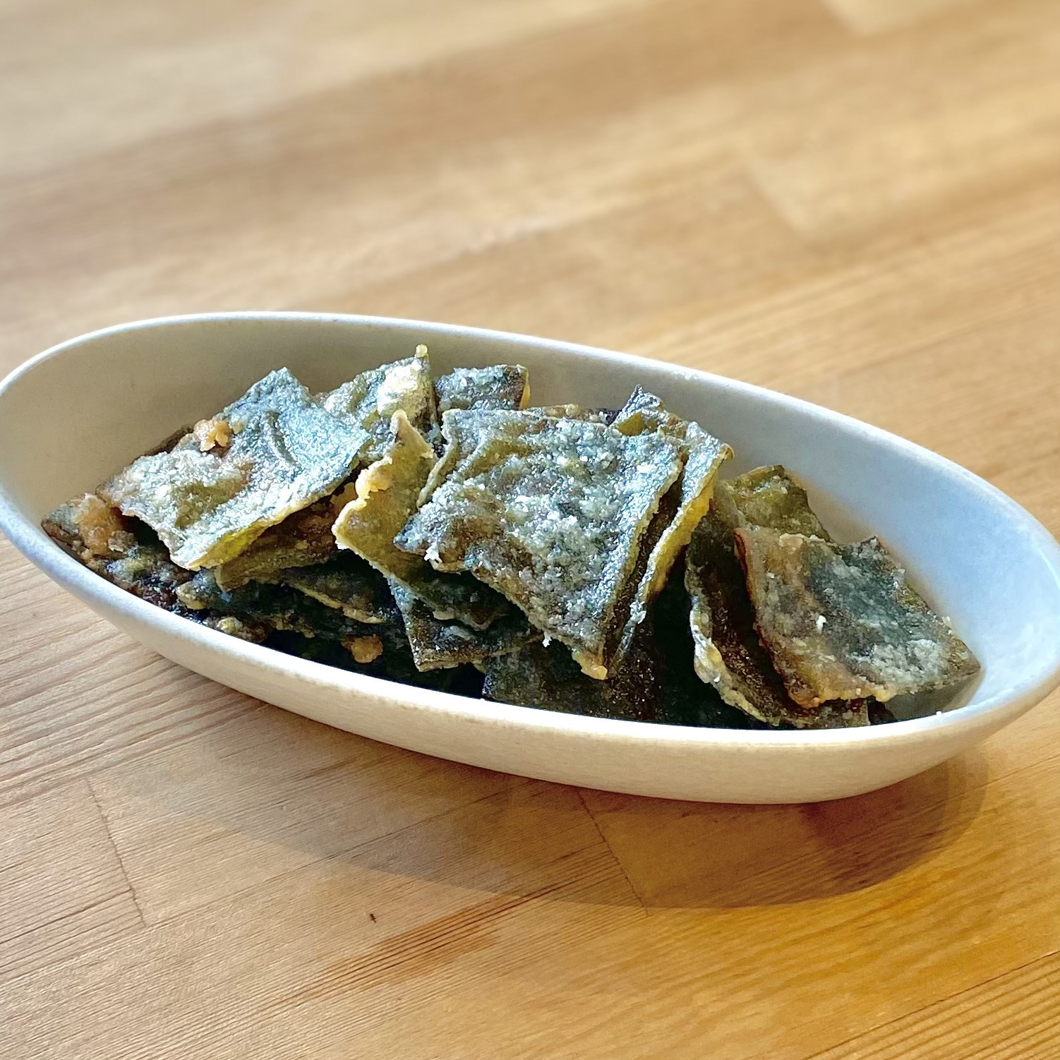 出汁に使った後の昆布をニンニクたまり醤油に漬けて、小麦粉で揚げたオヤツを、シェフが作ってくれました😋