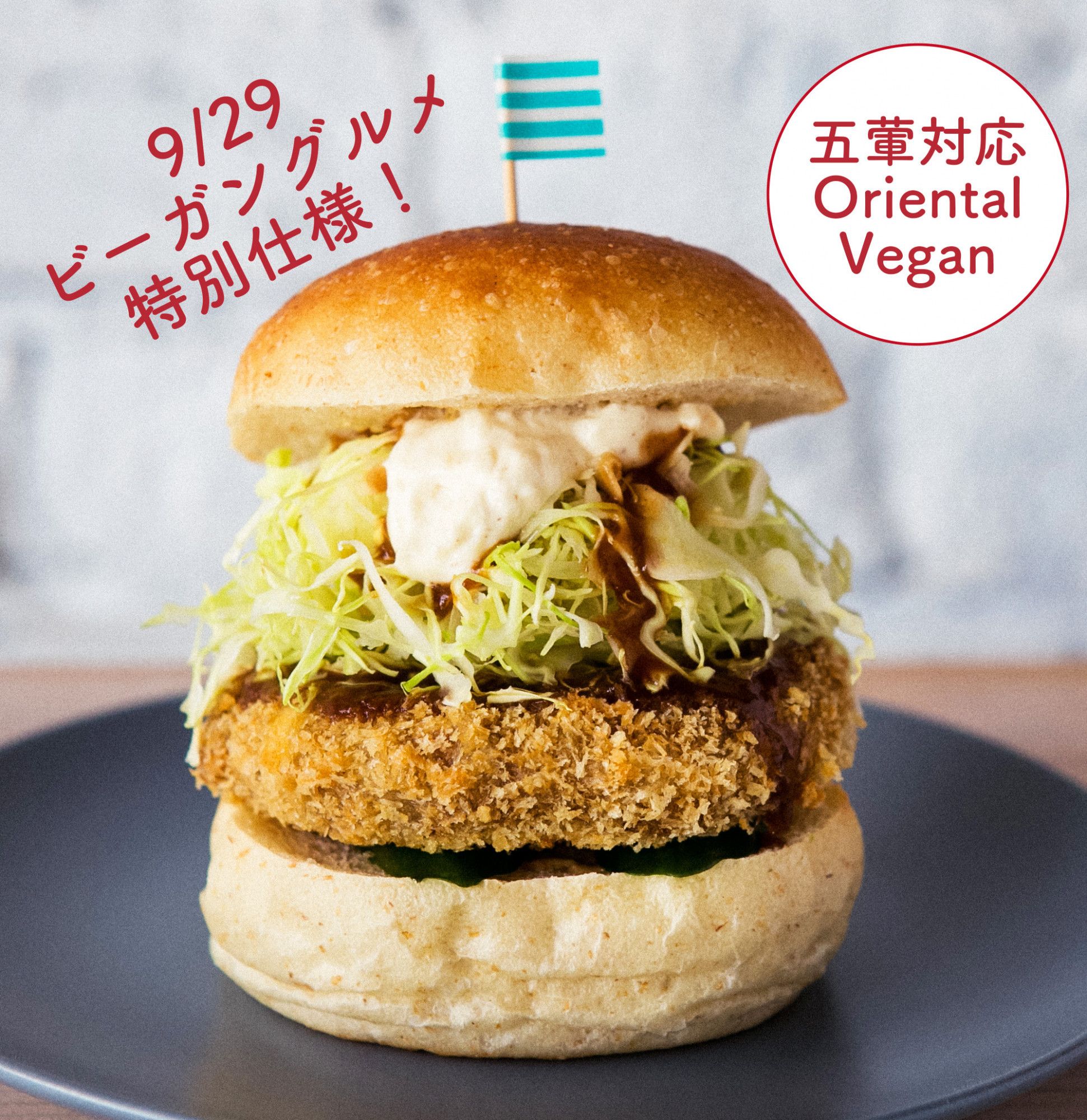 毎回好評をいただいている車麩カツバーガーですが、今回はいつもと違うソースに。オリエンタルビーガン(五葷抜き)対応です🖐️