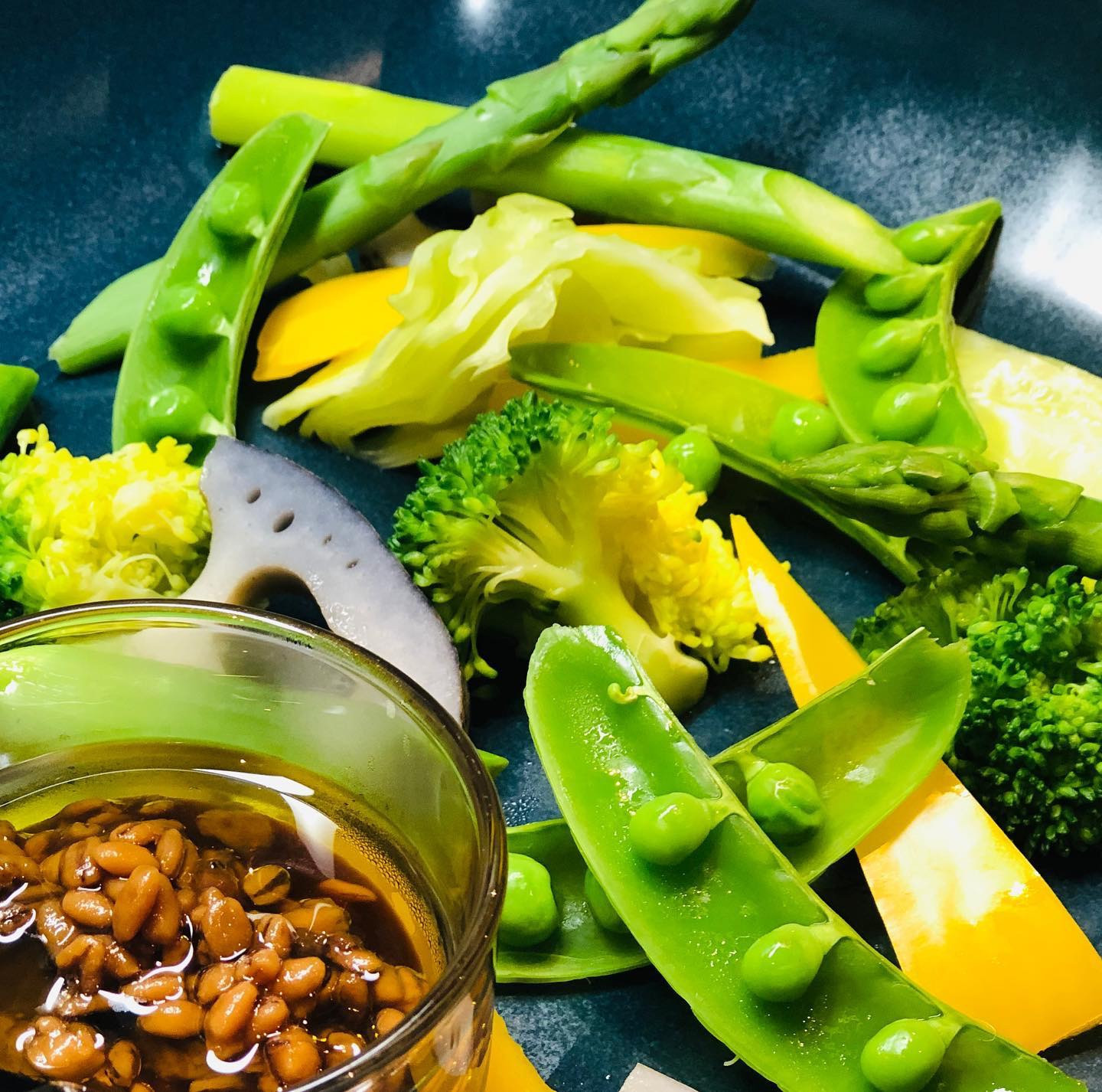 つやつやに蒸しあがった春の野菜に自家製のひしおを添えて🥦