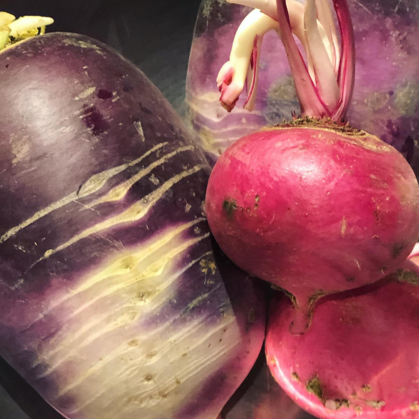 おはようございます🌞 今日も通常通りの営業です。 ご来店お待ちしてます🍴 写真は紫大根とピーチかぶ。 お皿を彩ってくれるカラフル野菜たち。 生のままサラダに散らしたり、塩漬けや酢漬けにし... -