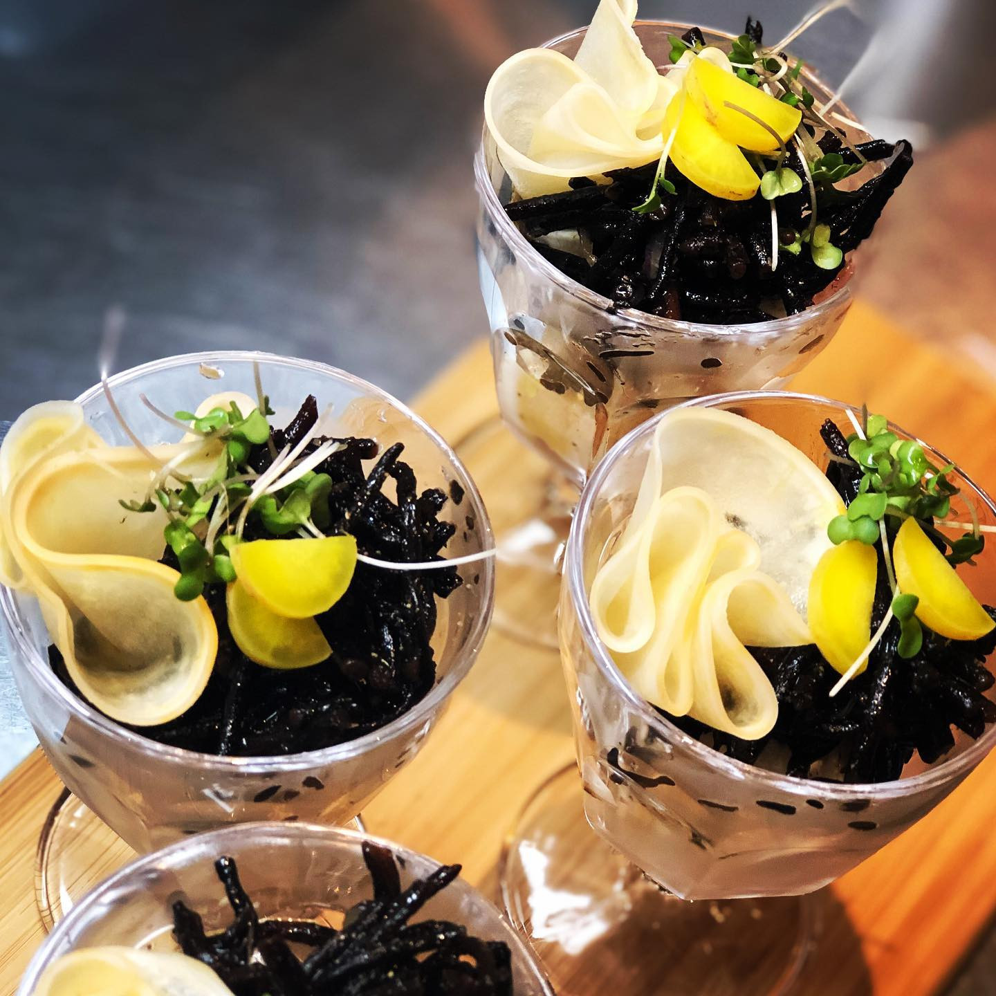 写真は夜のコースでお出ししている、豆腐の塩漬けとひじきの山椒マリネと黄金の株を合わせたオードブルです。 -