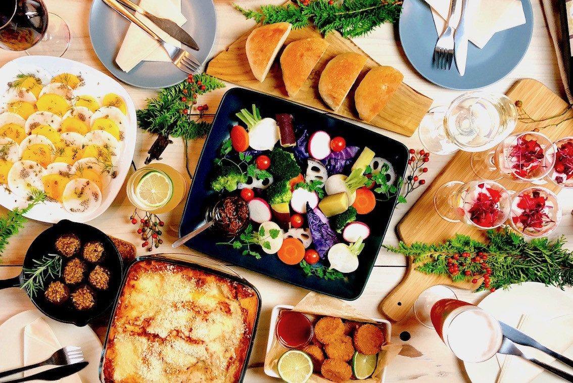 大皿の取り分けスタイルでヴィーガン料理のコースをお楽しみいただけます。
