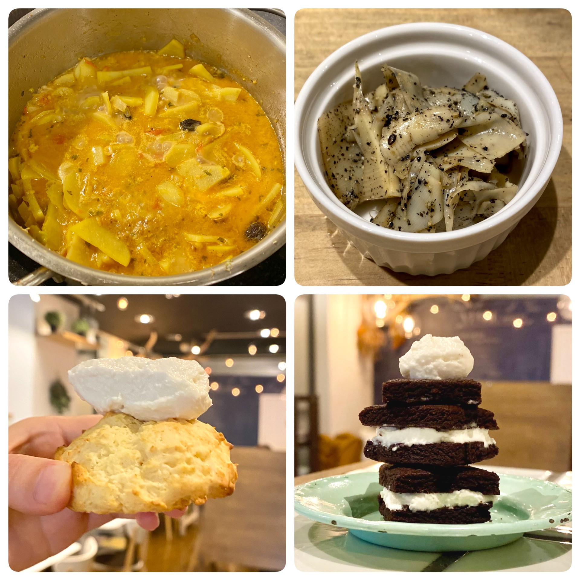 皆さんは①〜④のどれが食べてみたいですか?😄🩷 ①ハーブ&スパイスの魔術師のシェフが作ったじゃが芋カレー🧙🪄 ②筍(姫皮)の胡麻和え🎋 ③④甘党の店長の体を想った、オレオ風クッキー&...