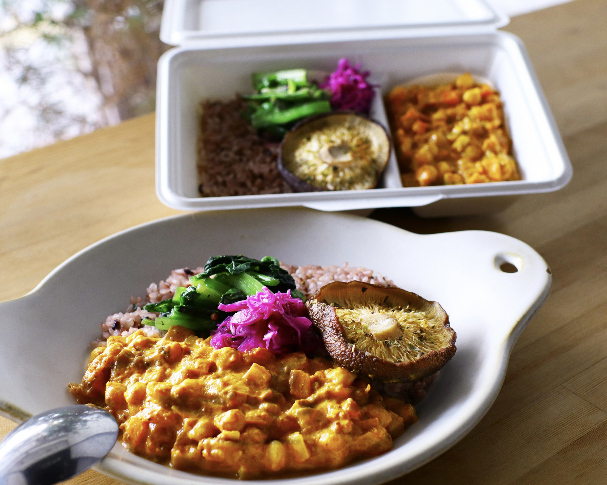 カレーはシャキシャキれんこんと人参の甘みと、ホクホクのひよこ豆とトマトの酸味をココナッツミルクで仕上げています。