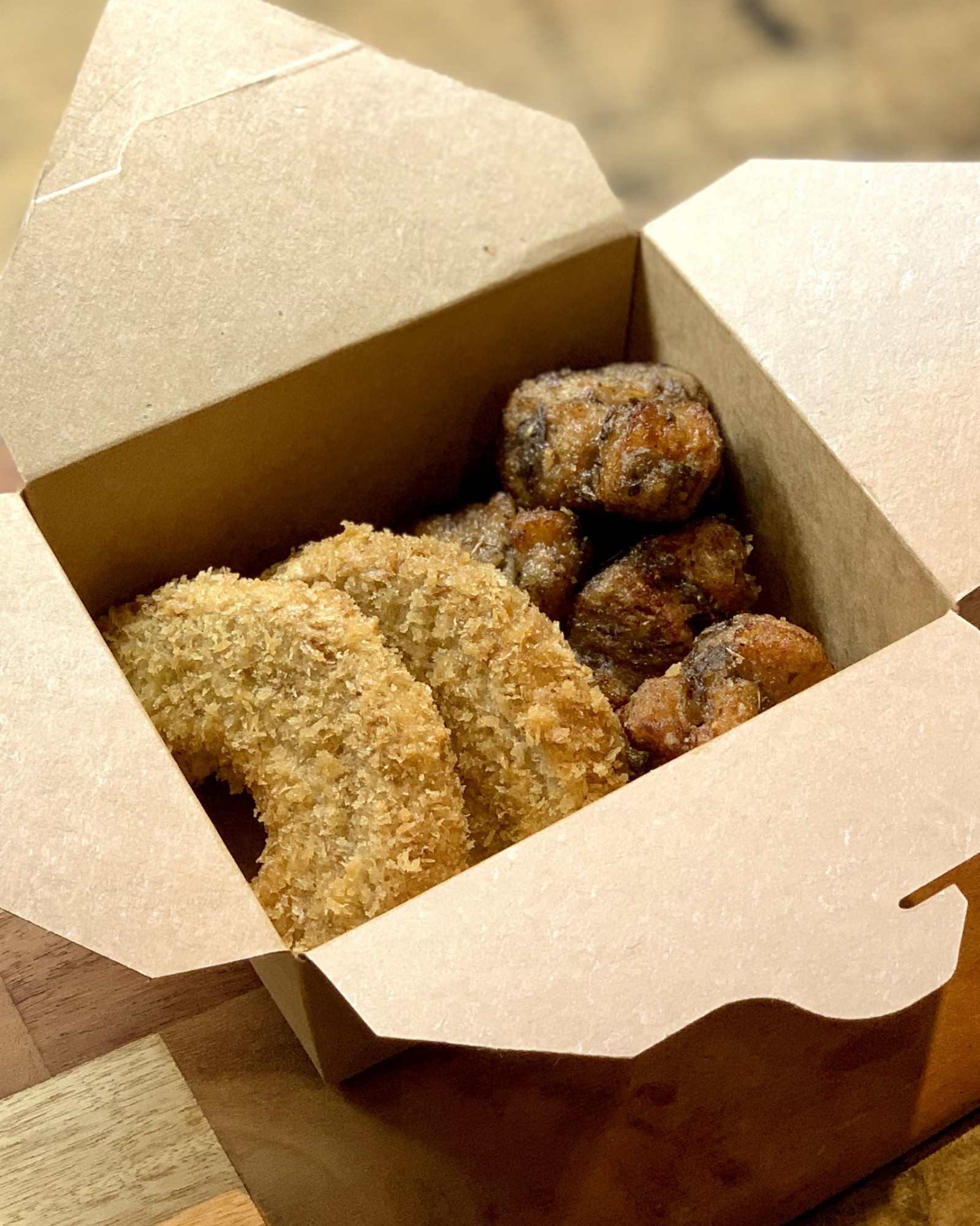 メインは車麩カツフライor唐揚げor厚揚げの1種類が入って、1つ1人前位なので、よくバイト終わりに夕食用に夫の分も合わせて2つ買って帰ります🍽️