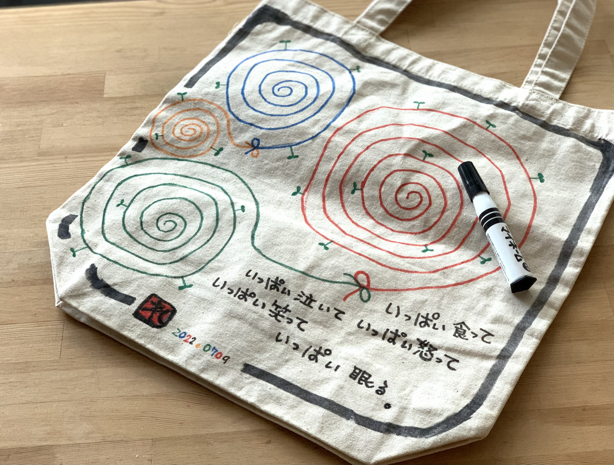 このワークショップは、無地のトートバックに自分で好きな絵・デザインを描いてもらうワークショップです。