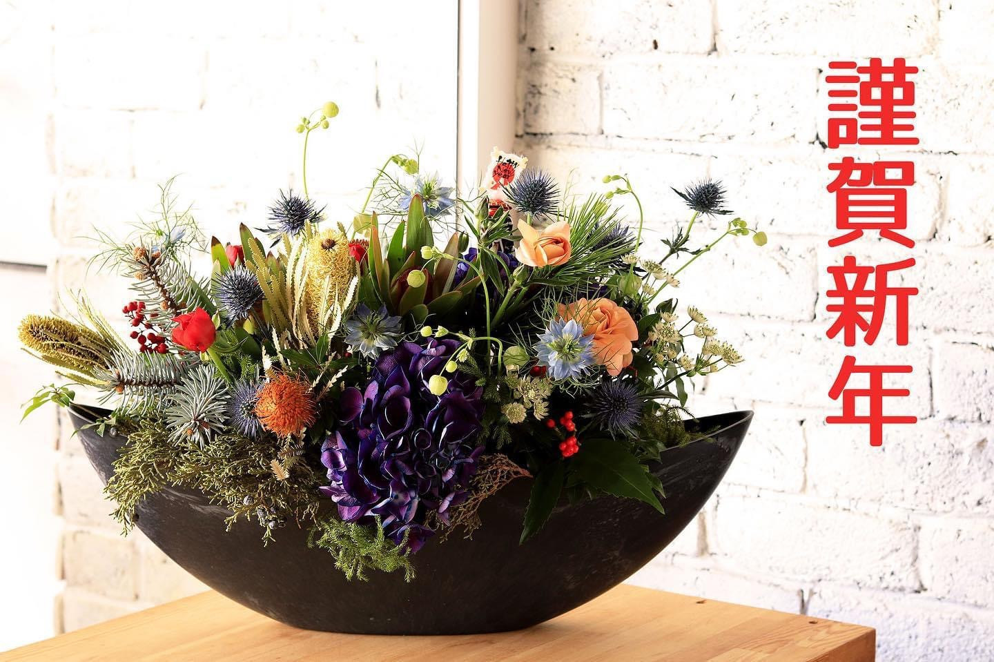 写真はいつもお世話になってるご近所の花国さんにお願いしたお花。お年初くらいは華やかにしたいなと思い毎年お願いしているのですが、今回も相変わらずのセンス!おかげさまでまた今日から新鮮な気持ちでお客様をお迎えすることができます。
