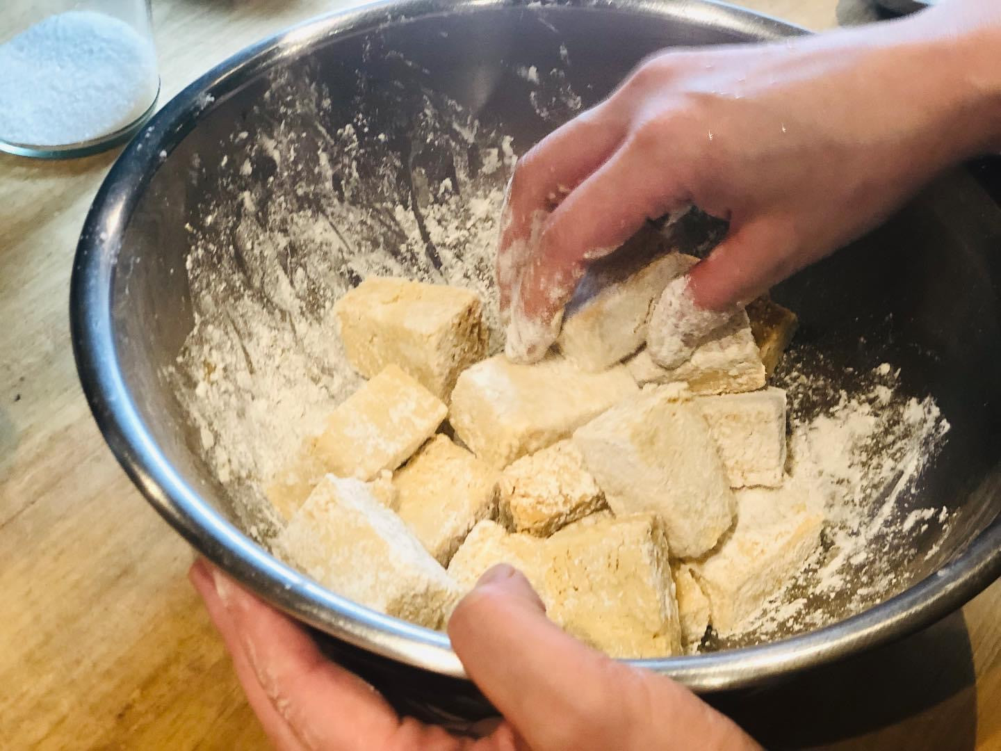写真はレシピ本にものせた豆腐のからあげを作ってるとこ。賞味期限がせまって使う予定がない豆腐はとりあえずパックのまま冷凍庫でストックしています。必要な時に解凍して揚げ物や煮物に。凍った豆腐はスポンジ状になるので、歯応えもいいし味の染み込みもバッチリ👍おいしく食べながら食品ロス削減にも繋がる一石二鳥の料理です。