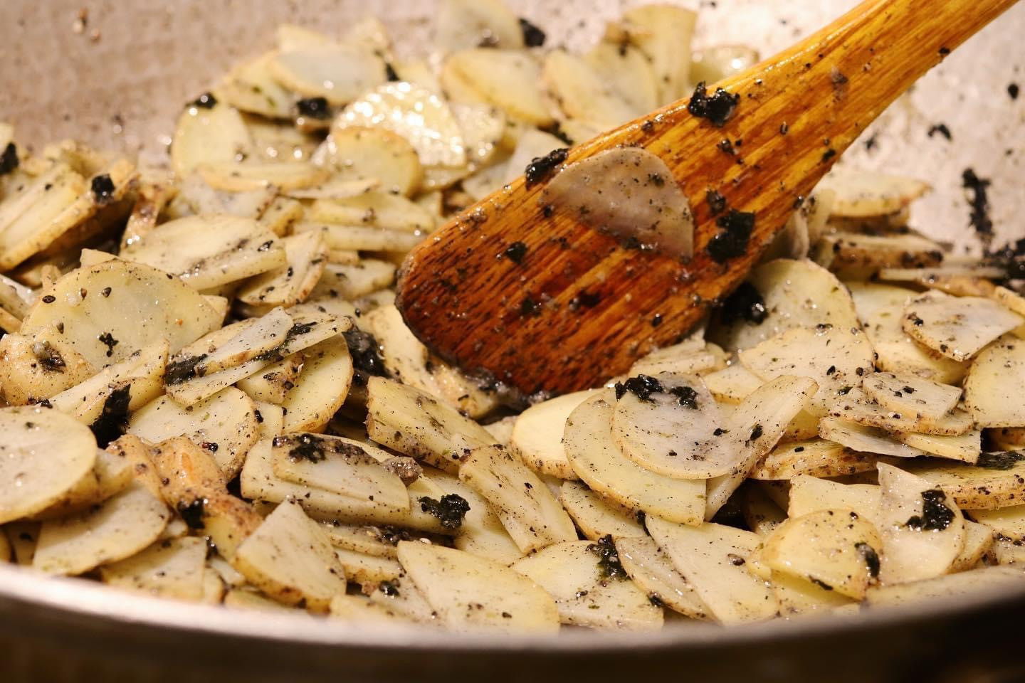 写真はじゃがいもの黒ゴマ海苔炒め。花椒がぴりんと効いてます。