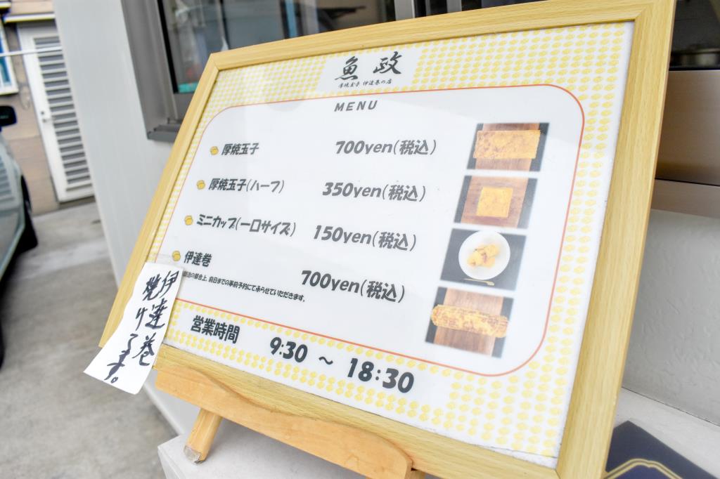・厚焼玉子 700円 ・厚焼玉子(ハーフ)350円 ・ミニカップ 150円 ・伊達巻 700円 ※伊達巻は製造の都合上、前日までの事前予約制 ※すべて税込み |