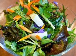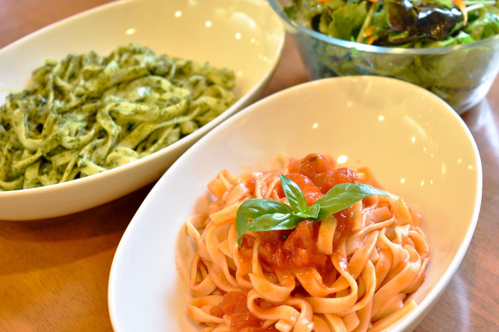 ランチには農園で採れた無農薬野菜たっぷりのサラダに、同じく野菜をたっぷり使用したもちもちの生パスタやカレーが味わえる。