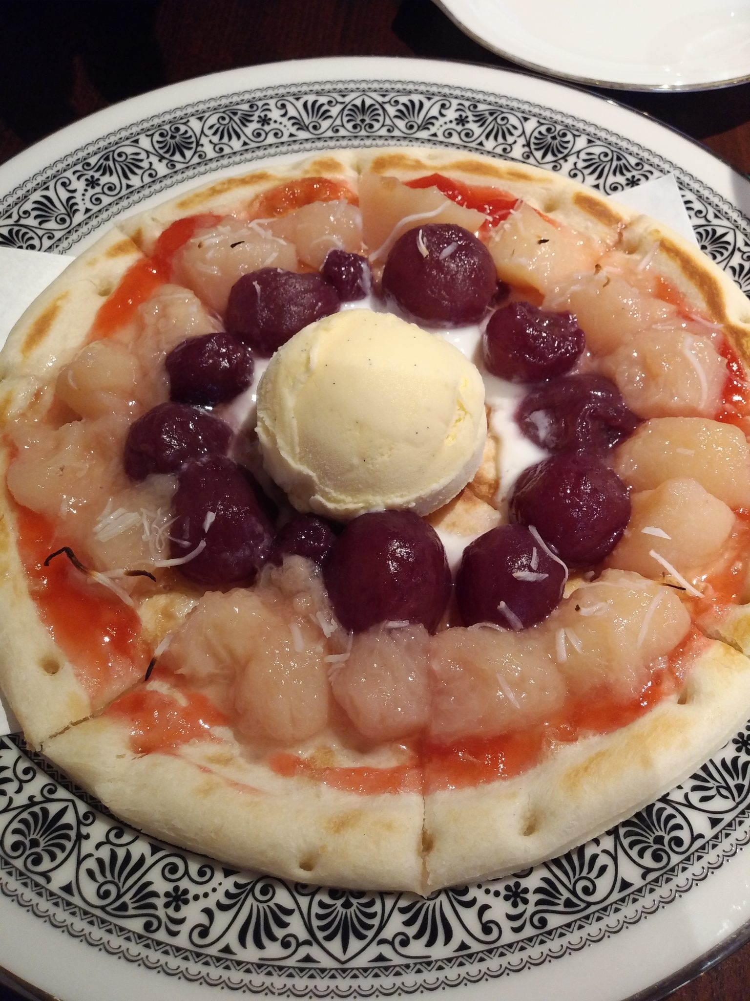 昇仙峡にある時から行ってみたいと思っていたお店が、夢小路に移転openしたと言うことで来店しました。葡萄と桃のピザを注文しました。葡萄と桃は甘煮になっていましたが、実自体がしっかりしていて、食感が良かったです。冷たいアイス、クリスピータイプのピザ生地、美味しい葡萄と桃、美味しく頂きました。
