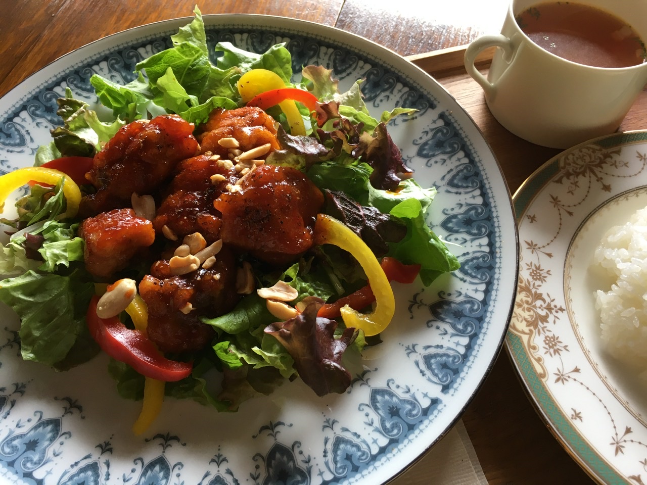 古民家カフェ初体験。雰囲気がすごくいいところで落ち着けます。友人はカレーを、私はヤンニョムチキン的なものをチョイス。カレーは一口もらったらスパイスが効いて美味しかった。チキンは甘辛タレでから揚げを絡めているまさにヤンニョムチキン?見た目もきれいでした。でもちょっと物足りない気が…、あと一品副菜ついてたら嬉しい。味は美味しかったです。また行きたいと思いました。あと、お皿やカップがどれも素敵でした。