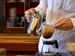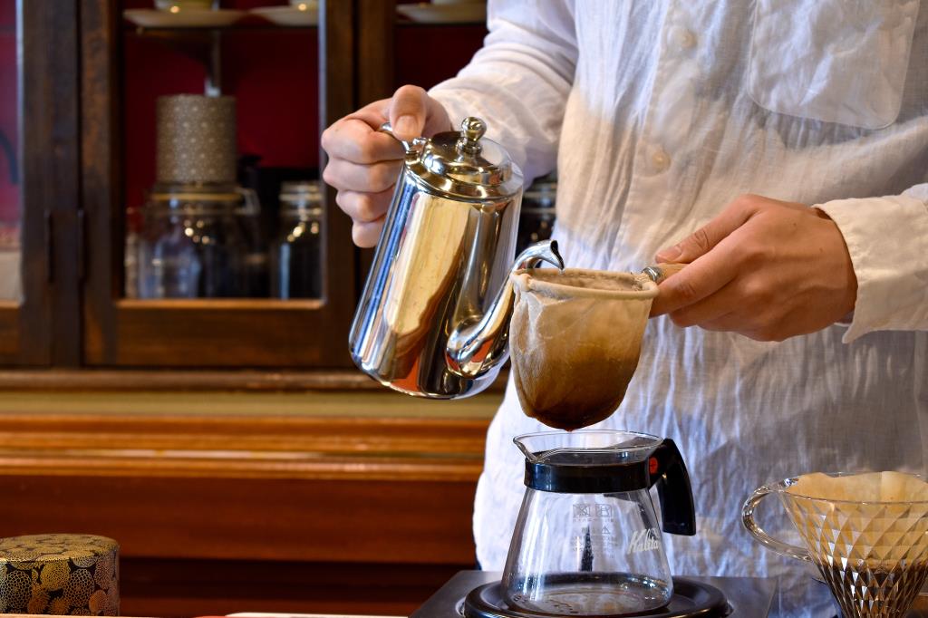 濃い目や濃厚の珈琲はネルドリップで淹れ、点滴法を用いているため後味が甘くまろやかな珈琲が仕上がる。