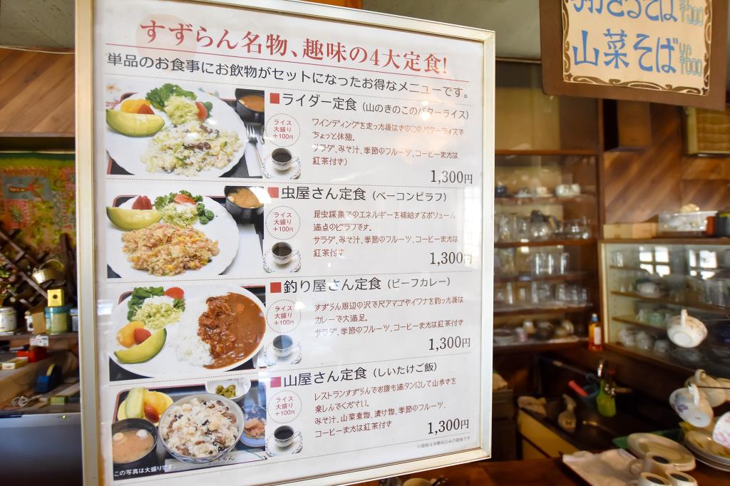 ・ライダー定食(山のきのこバターライス) 1,300円 ・虫屋さん定食(ベーコンピラフ) 1,300円 ・釣り屋さん定食(ビーフカレ) 1,300円 ・山屋さん定食(しいたけご飯) 1,300円 ・季節の御膳 2,000円 ※税込み |