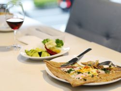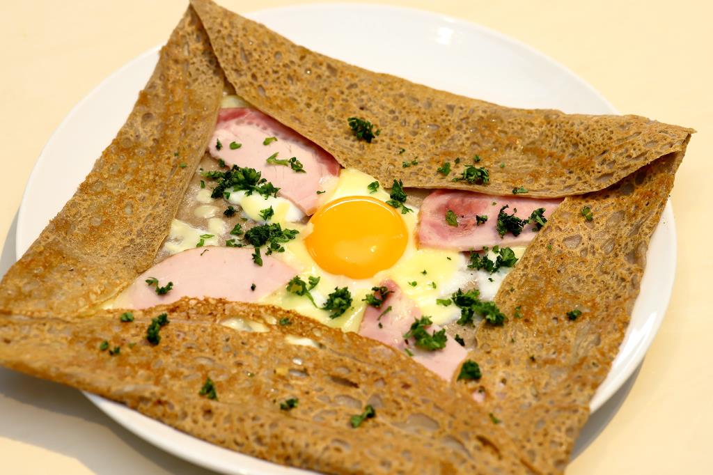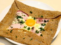 看板メニューのガレットは梨北産のそば粉に、八ヶ岳で放し飼いされた健康的な鶏の新鮮卵を使用。