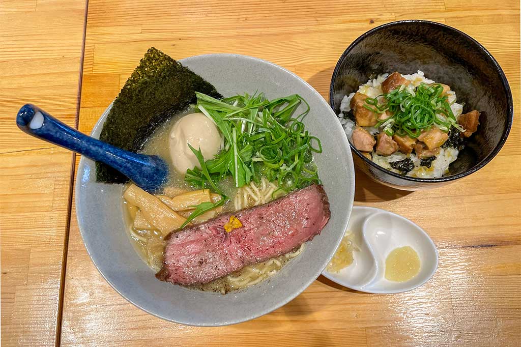 牛や鶏のまろやかなスープと細ストレート麺も相性抜群で絶品!柚子胡椒がきいたチャーシュー丼もおすすめ。