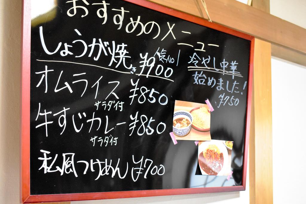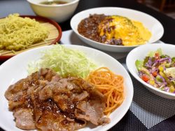 自家栽培の生姜をたっぷり使用した生姜焼きや、複数の食材から出汁を取るこだわりのラーメン、3日間かけてじっくりと煮込むお肉ほろほろの牛すじカレーなどボリューム満点のメニューが並ぶ。