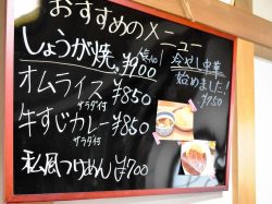 <ランチ(コーヒー付き)> ・生姜焼き定食 900円 ・今日のパスタ 850円 ・鍋焼きうどん 800円 ・私風つけ麺 700円 ・お楽しみメニュー(要予約) ※全て税込 |