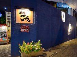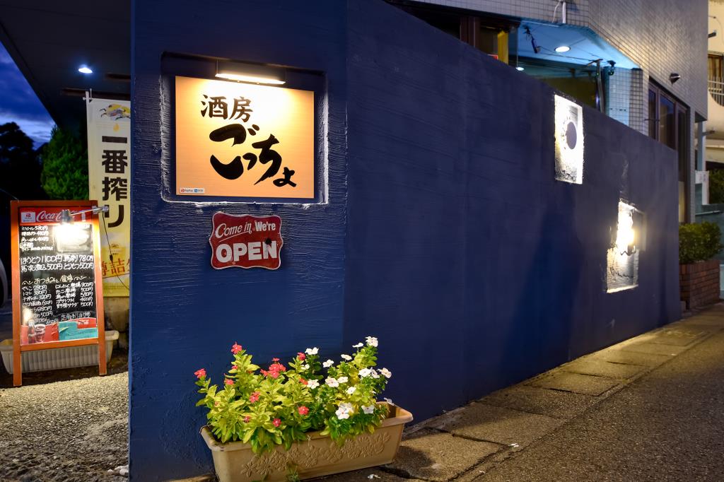 甲府市湯村温泉街に佇む青い壁が目印の「酒房ごっちょ」。
