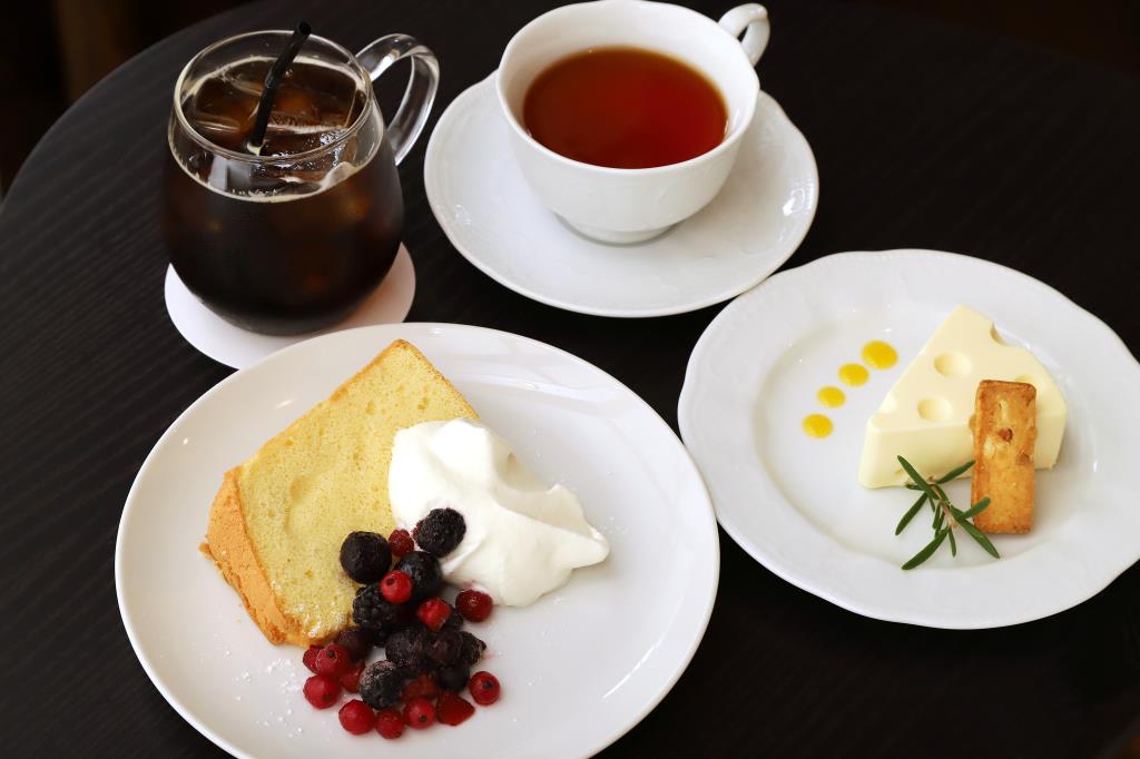2階カフェスペースではパティシエ自家製のシフォンケーキ、季節のマフィン、ケーキ、ドリンクが堪能できる。シフォン・マフィンは季節ごとに変わり、こちらもお楽しみ。