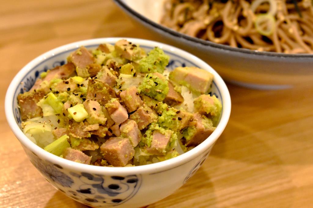 ・肉そば 728円 (揚げ玉入れ放題/生玉子無料) ・わさび肉めし 291円 ・ネギ餃子 637円 ※税別 |