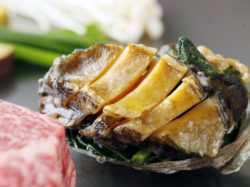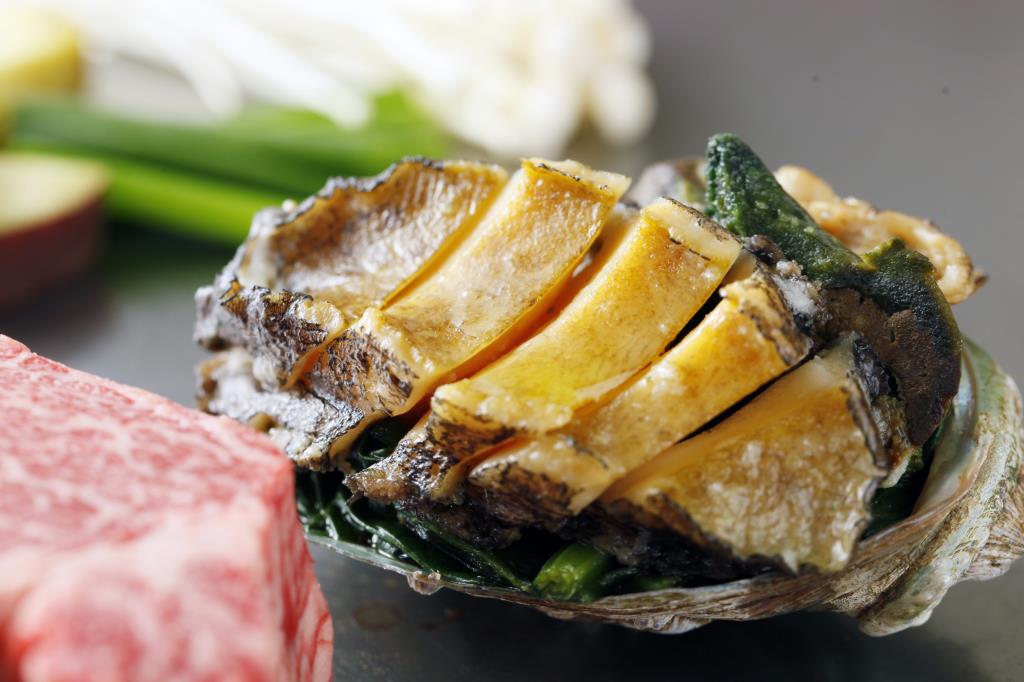 ご主人が目の前の鉄板で焼いてくれるのは、A4・A5ランクの甲州牛と水槽から出したばかりの生きたアワビ。