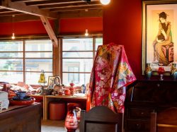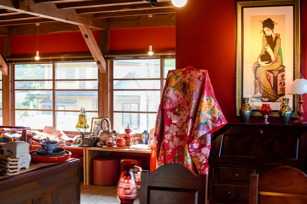 2階には着物や帯などを展示・販売しており、格安で着物のレンタルや着付けを受け付けている。