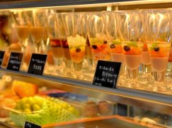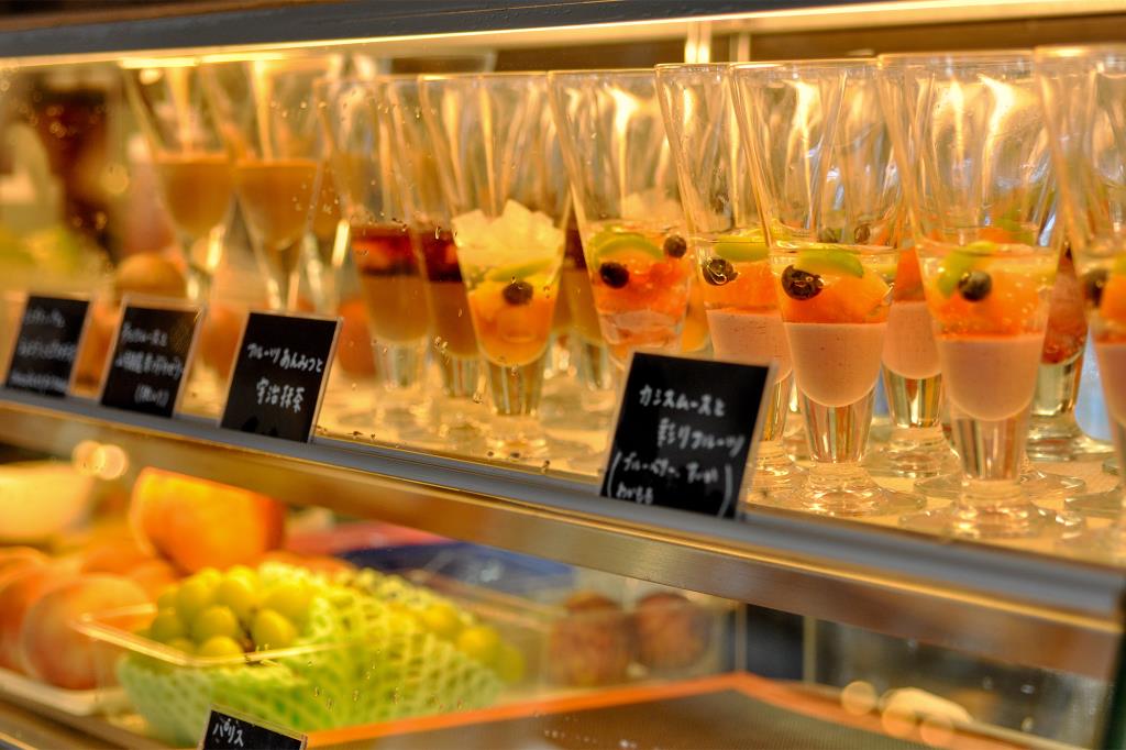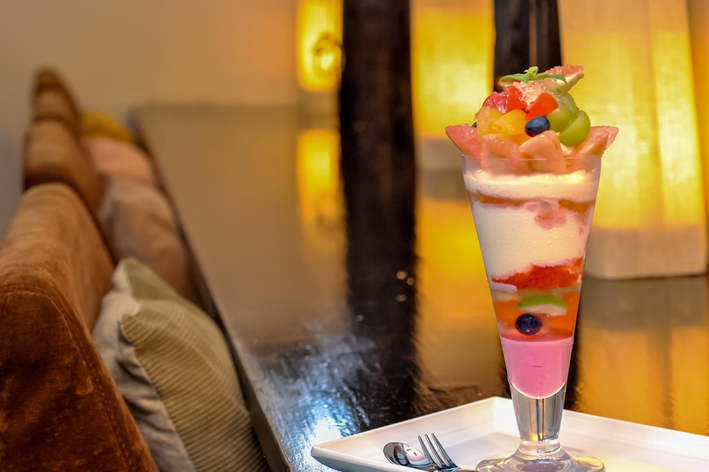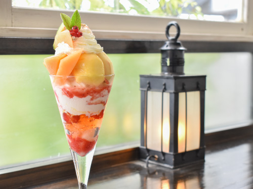 旬のフルーツを贅沢に盛り付けたフルーツパフェがおすすめ。パフェの下に入っているムースやゼリーのベースを自分でお好きなものを選べる楽しみも♪