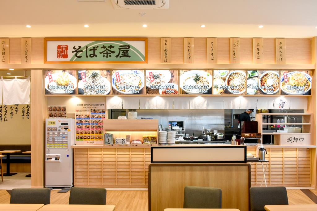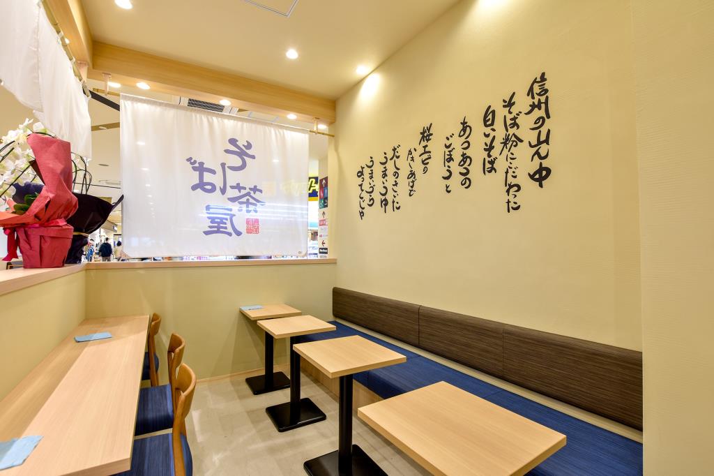 フードコートと区切られた、そば茶屋専用の個室感覚スペースがあり、落ち着いた空間でゆっくり食事を楽しめる。