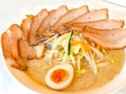 塩白湯ラーメンをいただいたのですが、最初ピーナッツの香ばしい良いにおいがして、スープを味見したら見た目に反してそれほど味...