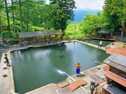 広々とした釣り堀では、ニジマスの他、シーズンでアマゴ・ヤマメも♪釣りたてを楽しめるセルフ塩焼きは火起こしやさばき方等もレクチャーしてくれるのが嬉しい♪