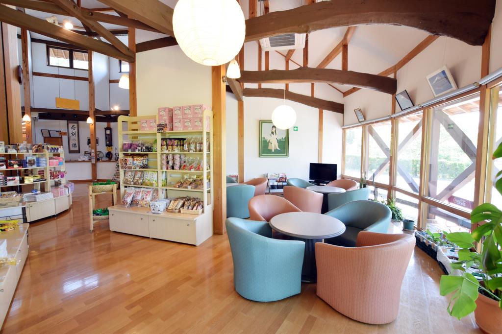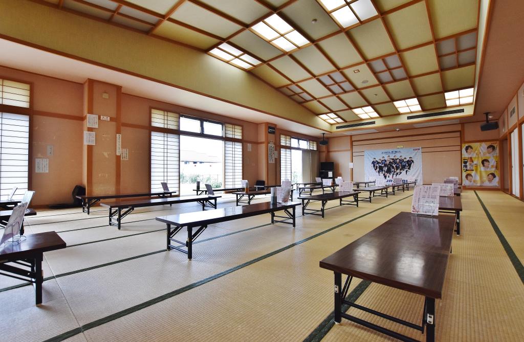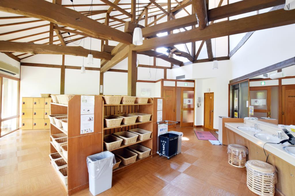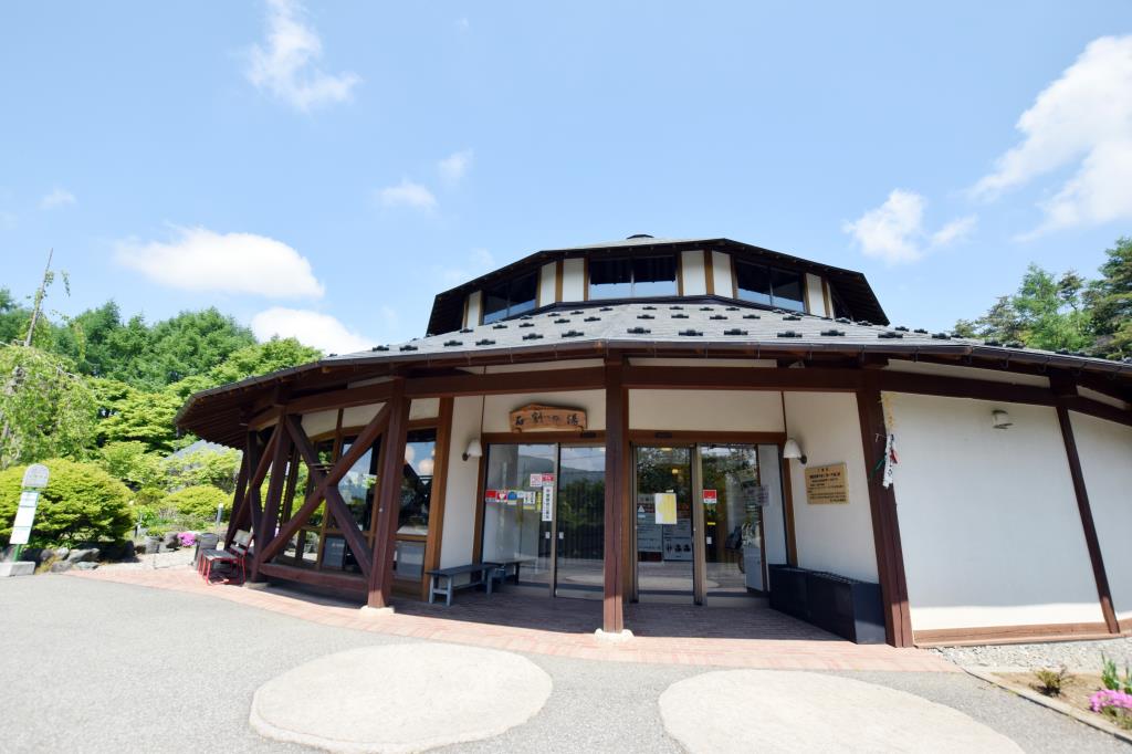石割山の麓、山梨県産のクリやヒノキをふんだんに使用し、木造建築独特の梁組を生かしたドーム型の日帰り温泉施設。