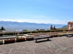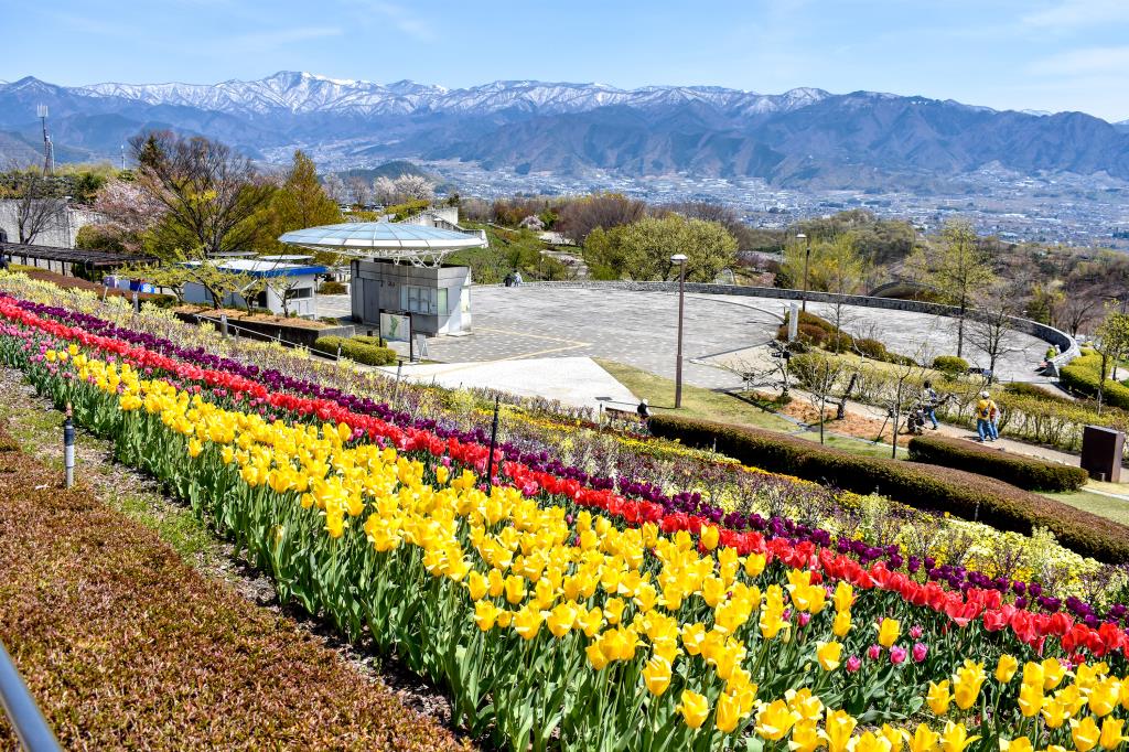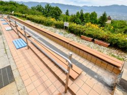 富士山を背景にした山並みと甲府盆地を一望できる新日本三大夜景展望広場にある足湯施設。